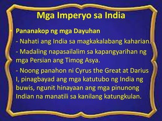 Mga Kaisipang Asyano sa Pagbuo ng Imperyo SlideShare uses cookies to improve functionality and performance and to provide you with relevant advertising. Ang hari rin ang tagapamagitan sa ibat-ibang pamayanan at mga mapayapang uganayan nila sa isat-isa na kailangan upang patuloy ang kasaganaan sa lipunan. Sa mga impluwensya s mga pagbabagong ito higit na lumutang ang kaisipang Asyanopilosopiya at relihiyon.