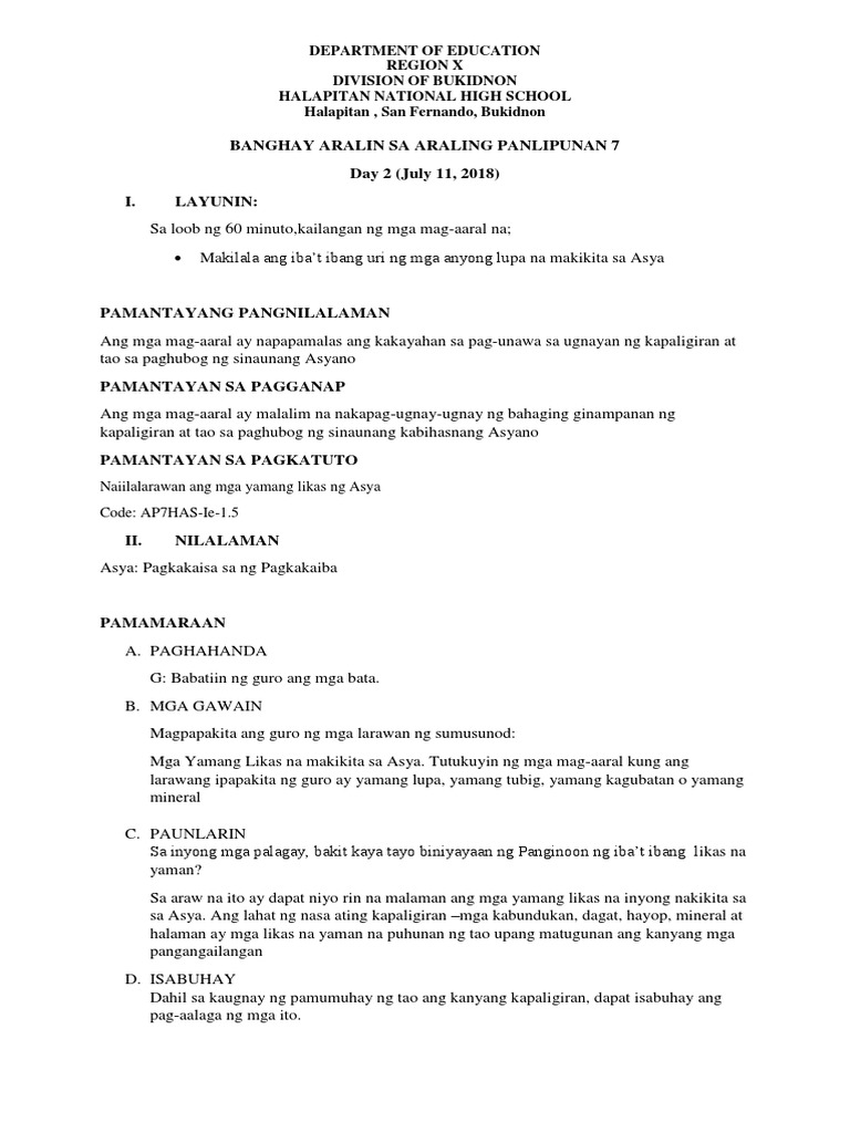 HAPITAN BUNGSUAN NATIONAL HIGH SCHOOL PRACTICE TEACHER CAPSU DUMARAO Dumarao Capiz LESSON PLAN SA ARALING PANLIPUNAN 8 - ONYX Oktubre 16 2016 I. June 2 2018 November 2 2019. Download PDF - Syllabus Araling Asyano 7 el9rr6665xly.