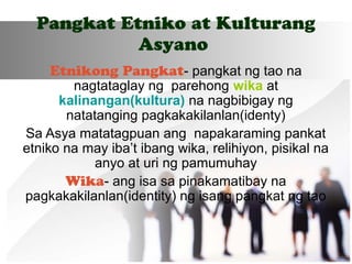 Mangyan at Kulo-kulo Tumingin ng iba pang Mga pangkat etniko sa Pilipinas. Pangkat Etniko at Kulturang Asyano Etnikong Pangkat- pangkat ng tao na nagtataglay ng parehong wika at kalinangan kultura na nagbibigay ng natatanging pagkakakilanlan identy Sa Asya matatagpuan ang napakaraming pankat etniko na may ibat ibang wika relihiyon pisikal na anyo at uri ng pamumuhay Wika- ang isa sa. Pangkat Etniko at Kulturang Asyano Etnolingwistiko-Ang pagkakahati ng mga tao sa Asya sa ibat ibang pangkat batay sa wika at etnisidad na kinabibilangan.