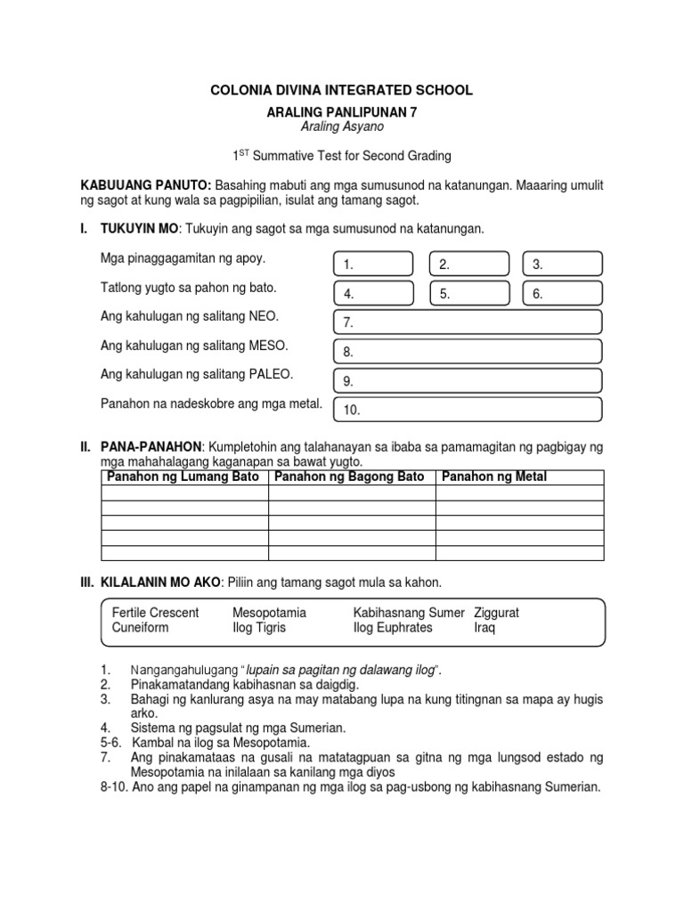 Indibidwal Tingnan ang tsart sa susunod na pahina at isulat ang hinihingi sa mga sumusunod. May mga tulong sa pag-aaral na inihanda para sa iyo. The study aimed to develop and validate an achievement test in Araling Asyano for Grade 7 students that can measure the mastered and least mastered skills in the K-12 Araling Panlipunan.